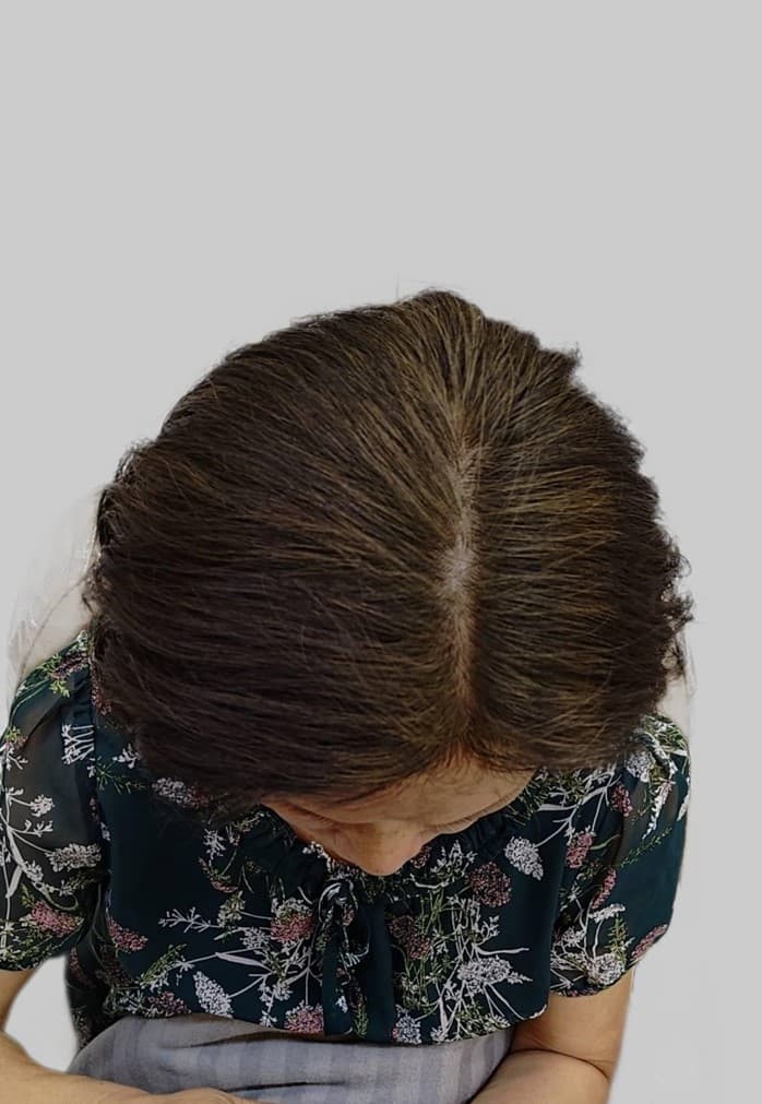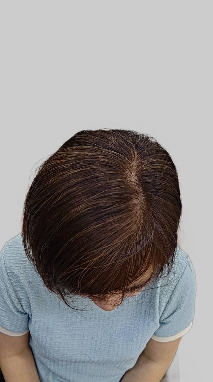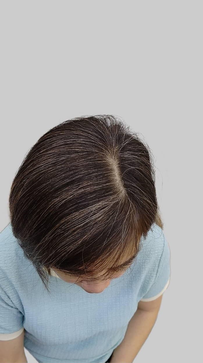 原本每月補染深黑,常被學生說「看起來很累」。改用有機染白髮後,髮色轉為自然深棕,白髮不再突兀,整體氣色明顯提升。